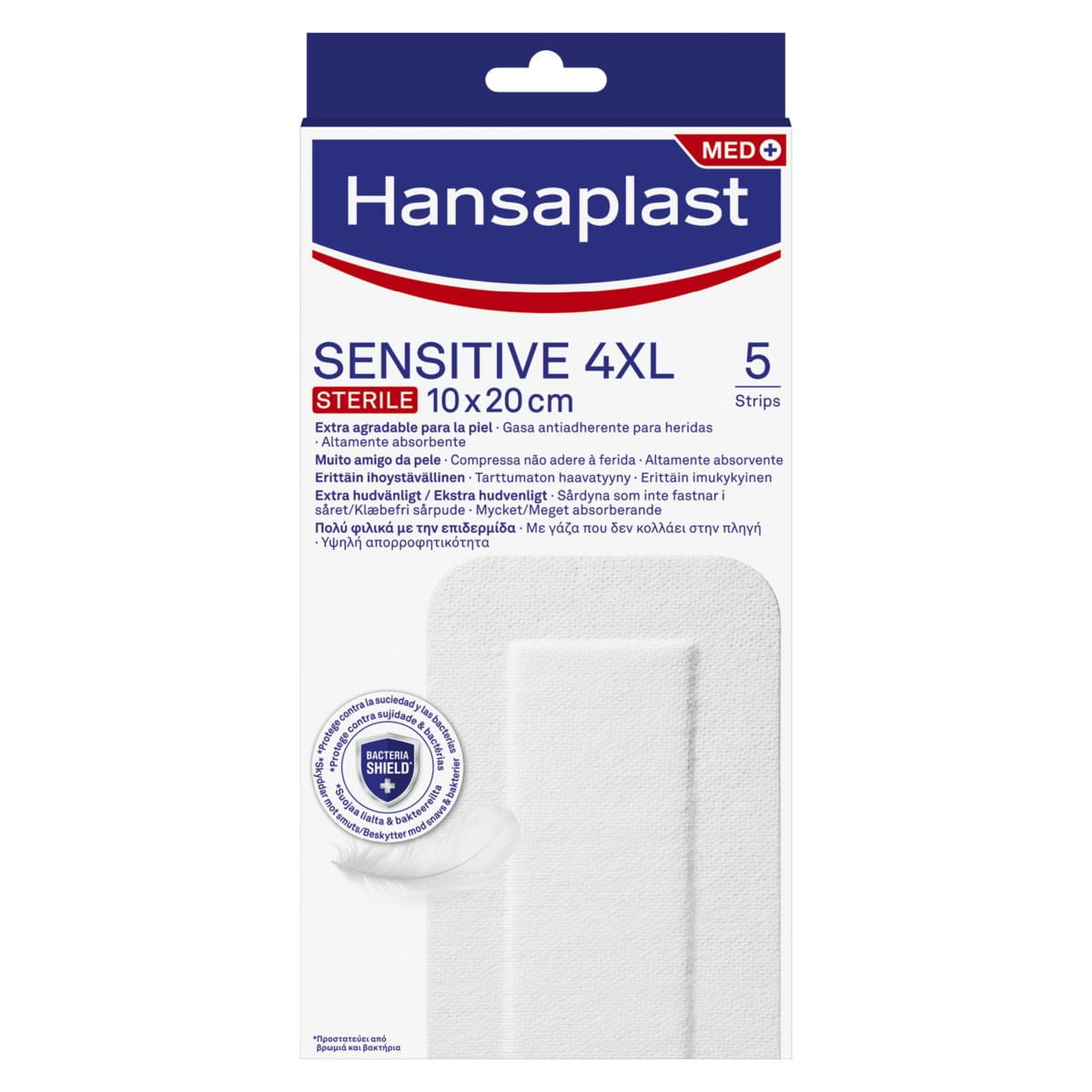 Hansaplast Sensitive XL, XXL, 3XL og 4XL plastre er steril sår bandage til vandtætte beskyttelse of større or post-operative sår. Det ekstra hudvenlige og åndbare materiale klæber pålideligt til huden, men det er stadig smertefrit at fjerne. Den ekstra store sårpude er føles blød mod dit sår sår uden at klistre sig fast i det, og er den yderst behagelig at bruge.Bacteria ShieldHansaplast Bacteria Shield plaster skaber en beskyttende barriere, som forhindrer 99 % af bakterierne i at komme i kontakt med såret. Læs mere om, hvordan vores Bacteria Shield virker her: Beskyt mod infektion med Hansaplast Bacteria Shield plastre.